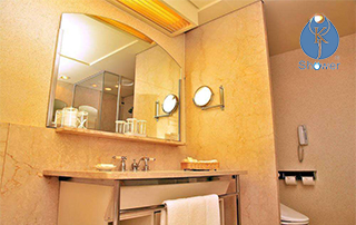 淡色斑紋的大理石地磚在衛(wèi)浴間里大面積運用,衛(wèi)浴全體空間很大,大理石斑紋新鮮高雅,更易襯托出大空間的溫潤明媚感。為了避免空間太冷,精美的地毯是不錯的軟裝配飾。用瓷磚冷、暖色的對比來裝飾澡堂,絕對是一個好辦法。運用瓷磚創(chuàng)造出獨具特色的澡堂風格。不僅在顏色上力求改變,鋪貼的方向和形狀都可以大做文章。